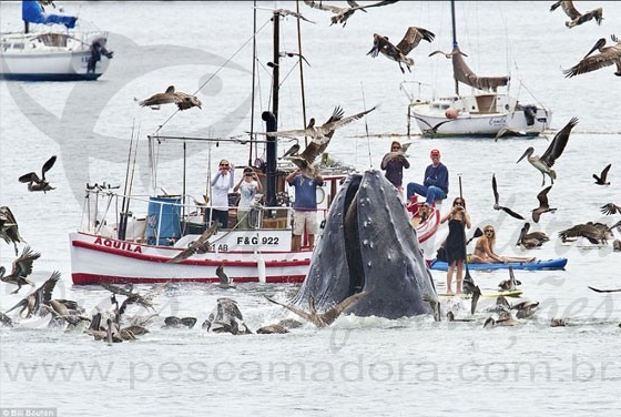 Fotógrafo amador flagra baleia-jubarte emergindo ao lado de barco