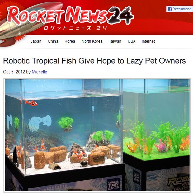 Cuidar de animais de estimação requer bastante paciência e envolve responsabilidades como alimentar o bicho, limpar a sujeira, entre outros. Uma empresa no Japão criou uma espécie de “peixe-robô”, que livra o dono de qualquer responsabilidade a respeito de cuidados com seu bicho, já que ele não precisa comer e se adapta a qualquer ambiente.