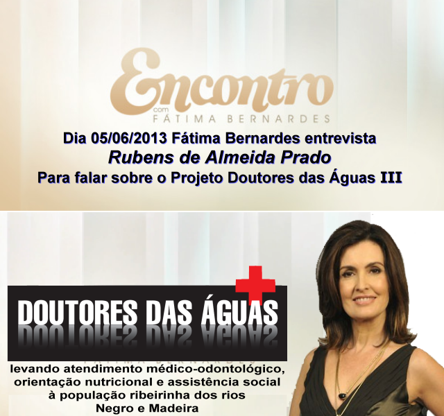 Projeto Doutores das ÁguasNo próximo dia 05 de junho, Rubens de Almeida Prado (O Rubinho), coordenador geral do projeto Doutores das Águas estará presente no programa Encontro, apresentado diariamente por Fátima Bernardes na rede Globo, para falar sobre a edição 2013 realizada em abril desse ano nos Rios Negro e Madeira.