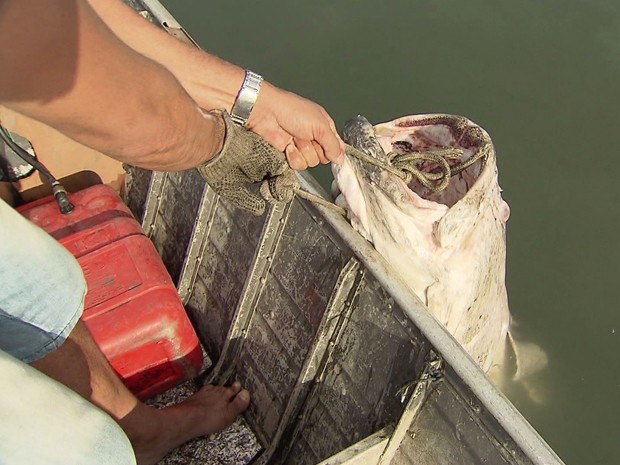 Um mero de aproximadamente 150 quilos foi encontrado boiando próximo ao Porto de Santos, no litoral de São Paulo. O espécime é apenas um dos milhares de peixes que apareceram mortos após o incêndio de grandes proporções que atingiu seis terminais de açúcar do cais santista na última sexta-feira (18).