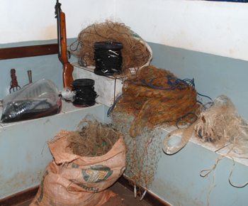 Na abordagem foram encontrados apetrechos de pesca sendo: duas (2) tarrafas, três (3) redes, que juntas totalizaram 55m (cinquenta e cinco metros), duas (2) fisgas, trinta e sete (37) anzóis de galho; além de vinte (20) peixes da espécie TUVIRA, um peixe da espécie CORIMBA, um peixe da espécie DOURADO CACHORRO, um peixe da espécie LAMBARI, uma espingarda calibre 22 (vinte e dois) e onze (11) munições intactas calibre 22 (vinte e dois).