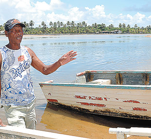 Aos 12 anos, quando começou a pescar, Carlos Antônio da Cunha viu na foz do Rio Joanes o seu sustento para a vida inteira. Ele se lembra da água límpida e de como o rio podia ser aproveitado. “As marisqueiras trabalhavam em paz, todo mundo pescava aqui. A gente bebia a água desse rio”, recorda o pescador que hoje tem 63 anos e sofre com a atual situação do rio, na praia de Buraquinho, em Lauro de Freitas, onde ele se encontra com o mar.