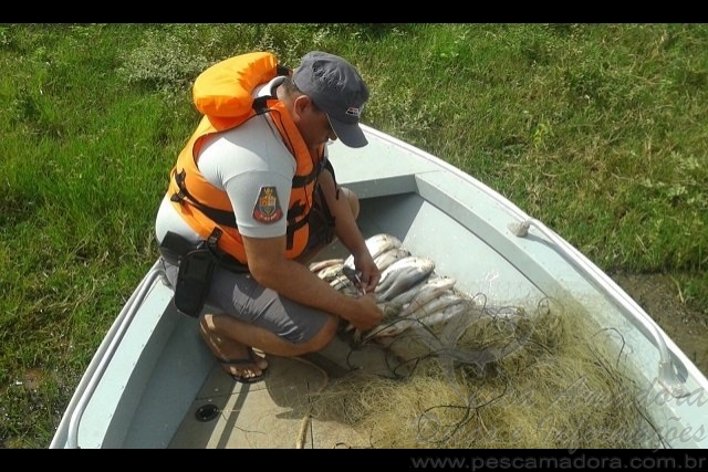 PMA flagra pesca ilegal e apreende redes e pescado no Rio Aracatuba-SPOs policiais constataram que os dois infratores usavam rede de nylon para pegar pescar os peixes, apetrecho que não é permitido o uso por pescadores amadores. Com eles foram encontros além da rede, 10 kg de pescado das espécies porquinho, corvina e tucunaré.