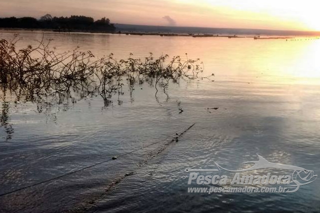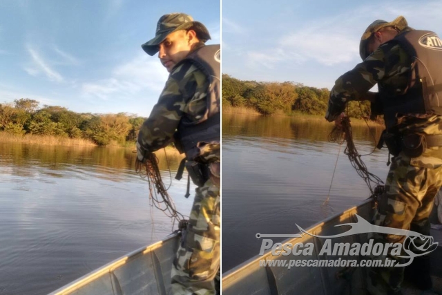 Após receber uma denúncia, os policiais fizeram patrulhamento aquático e encontram 1,2 mil metros de redes e 300 metros de espinhel sem identificação do proprietário armados de forma irregular em um trecho da represa.