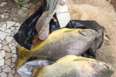 Foi solicitado ao suspeito para que retirasse todo o material do interior da residência para vistoria. Foram encontrados 21 quilos de pescado fresco das espécies pacu e pintado, rede de pesca, tarrafa, boias de pesca (petrechos proibidos), além de uma espingarda calibre 22, que não possuía registro.
