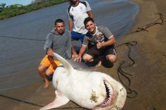 De acordo com os pescadores que capturaram o animal, ele ficou preso na rede na noite de segunda-feira e foi achado na manhã de terça. “Esse tubarão é de espécie desconhecida até mesmo para pescadores da região. Falaram em uma mistura da espécie tintureiro com barriga branca. Eles entraram na barra rebocando o animal porque o barco era pequeno e não dava para colocar para cima”, disse Matheus Manhães.