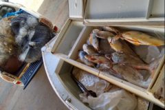 Também foram localizadas cabeças e vísceras de peixes às margens do rio. A poucos metros, havia uma geladeira “velha” utilizada como caixa térmica para acondicionar o pescado, contendo em seu interior 36 quilos de peixes das espécies piapara, corvina, barbado, piau e curimba. Em outra geladeira “velha”, também utilizada como caixa térmica, havia mais 62 quilos de peixes das espécies piranha, armal filetado, pintado, traíra e tilápia em filés.