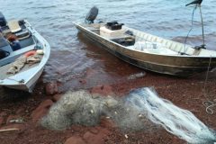 Ele foi multado em R$ 1,4 mil por estar pescando com redes no período da piracema, época de reprodução dos peixes. Além das redes, os policiais apreenderam um motor de popa, um motor elétrico e o barco em que ele estava.