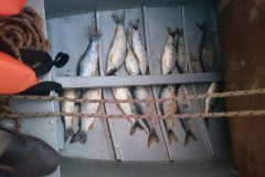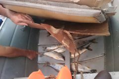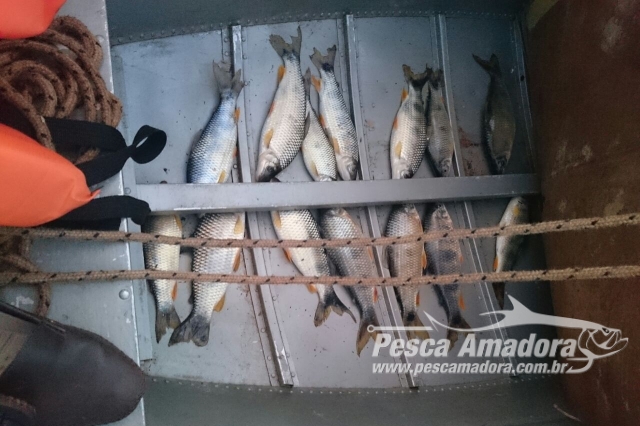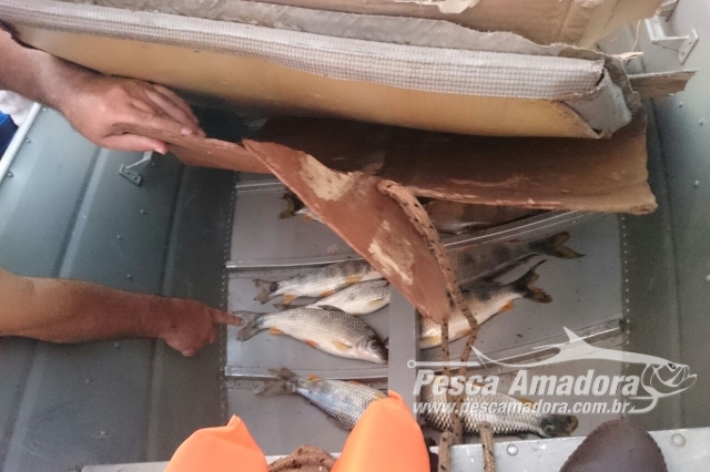 Durante patrulhamento fluvial, a equipe avistou uma embarcação saindo do Porto Camargo (PR) no rio Paraná. Na abordagem, os suspeitos negaram que estariam pescando, porém foram encontrados, escondidos dentro de colchonetes e embaixo de tapetes, 17 exemplares de peixes da espécie piapara que pesaram 8,6 quilos.
