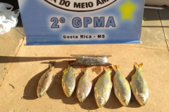 Durante fiscalização realizada na rodovia MS 135, nesse domingo (18), Policiais Militares Ambientais de Costa Rica (MS) prenderam dois homens que retornavam de uma pescaria ilegal. Os infratores estavam em um veículo, onde foram encontrados 5 kg de pescado da espécie piraputanga, que apresentavam marcas de captura por petrechos proibidos de malha (redes de pesca).
