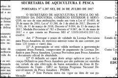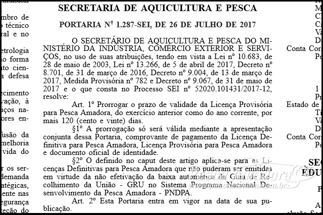 Conforme consta na publicação, a prorrogação só será válida mediante a apresentação conjunta da cópia da Portaria No- 1.287-SEI, DE 26 DE JULHO DE 2017, comprovante de pagamento da Licença Definitiva para Pesca Amadora, Licença Provisória para Pesca Amadora e documento oficial de identidade.