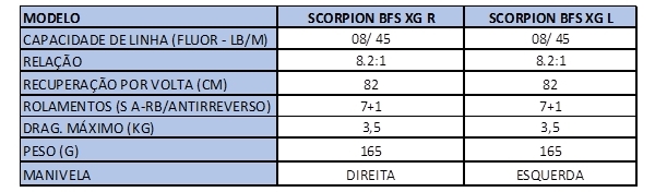 Versátil, a Scorpion BFS XG pode ser utilizada em água doce e salgada. Possui relação de recolhimento de 8.2:1 e drag máximo de 3,5 kg.