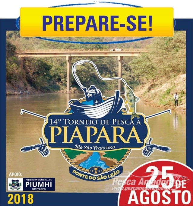Durante o 14° Torneio de Pesca à Piapara de Piumhi, serão sorteados entre os participantes, um barco Advance 5.0 lançamento 2018 da Pantanaltica e um pacote de pesca com 5 dias de hospedagem no pesqueiro da Odila no pantanal (MS). Todos os inscritos recebem um cupom para concorrer
