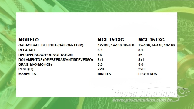 A Bantam MGL possui tamanho compacto, pesando 220 gramas. Apresenta drag máximo de 5 kg e relação de recolhimento de 8.1:1 na versão XG, que é a trazida oficialmente para o mercado brasileiro. Estão disponíveis os modelos 150XG e 151 XG.