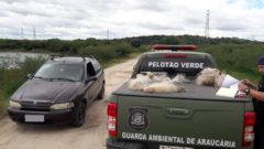 Em um veículo abordado pelos agentes, três infratores transportavam o material ilegal no porta malas do carro. Eles foram notificados a comparecer na Secretaria de Meio Ambiente onde deverão prestar esclarecimentos e multados conforme lei Federal 9605/98 que dispõe sobre as sanções penais e administrativas derivadas de condutas e atividades lesivas ao meio ambiente..