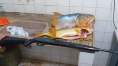 Policiais Militares Ambientais de Aquidauana (MS) realizavam fiscalização na noite dessa quinta-feira (4) na região da Ponte do Grego, no município de Terenos (MS), quando abordaram um veículo Chevrolet S10 e encontraram dois exemplares de peixes da espécie dourado (espécie com pesca proibida), pesando 7 kg, bem como um rifle calibre 22 e 32 munições.