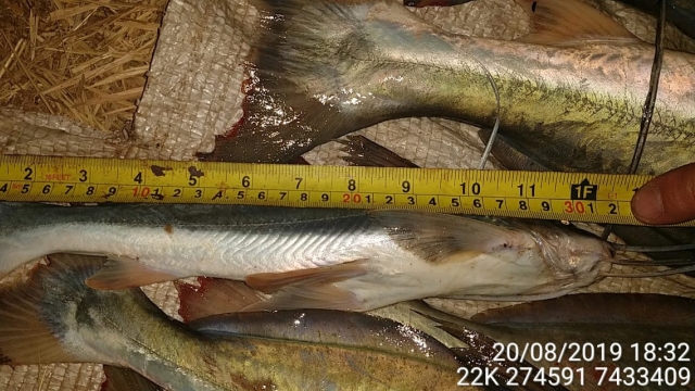 A equipe aguardou até que os infratores regressassem para a margem do rio quando abordaram dois pescadores. Com eles, foram apreendidos 28 kg de peixes da espécie barbado, sendo constatado que haviam capturado uma quantidade superior ao permitido, além de também capturar vários exemplares com os tamanhos inferiores ao permitido para a espécie, alguns com pouco mais de 30 cm.