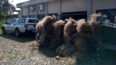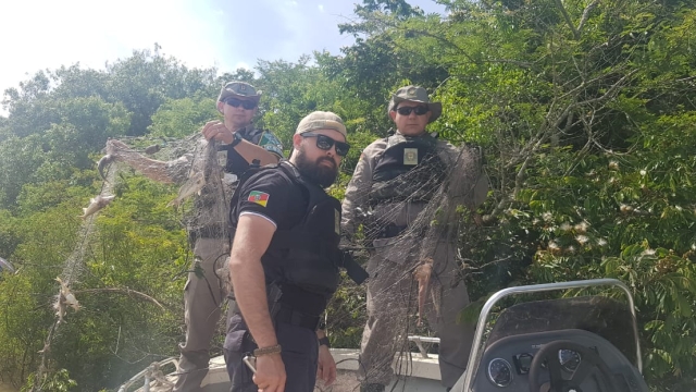 Em outro ponto, nas proximidades da Ilha Leopoldina, local denunciado por ser frequentado por caçadores, abigeatários e pescadores ilegais, foram apreendidos 5 mil metros de redes. Em sua maioria de malha predatória com tamanho inferior ao permitido pela legislação ambiental vigente. Também foram localizados couros, vísceras e cabeças de capivaras e ratão-do-banhado, que, pelos indícios, foram abatidos a tiros.