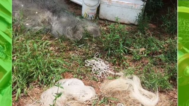 Com os infratores, foram localizados quatro tarrafas e cinco redes de pesca, material proibido para pesca, além de dois facões e 57 kg de pescado ilegal que estavam armazenados em uma caixa térmica de isopor.