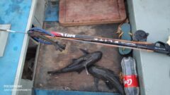 Com os envolvidos, que estavam em uma embarcação com motor de popa, foram encontrados um arbalete com seta, um par de nadadeiras, duas máscaras de mergulho com snorkel e três quilos de peixe da espécie cascudo, que apresentavam perfurações.