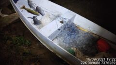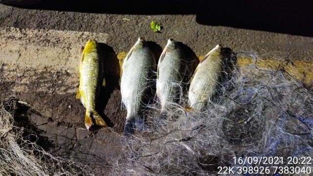 No local indicado, dois pescadores foram flagrados tarrafiando e correndo redes de emalhar. Ao atracarem na margem do rio, foram abordados pela equipe, momento em que um dos infratores pulou da embarcação e se evadiu nadando rio abaixo. Dentro do bote foram localizados 100 metros de redes de emalhar, 01 tarrafa, 3 peixes da espécie curimbatas e 01 peixe da espécie dourado, o qual está proibido sua captura.