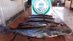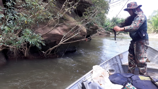 Em operação conjunta, Policiais Militares Ambientais de Jardim (MS) e de Bonito (MS) realizavam patrulhamento fluvial no rio Miranda, na operação piracema, no trecho entre a ponte da rodovia MS 382, no município de Guia Lopes da Laguna, ao Pesqueiro RB e, no local conhecido como “Poço da Sobradinho”, apreenderam quatro exemplares de peixes das espécies pintado e cachara. Os Policiais perceberam à margem do rio duas linhadas de mão e, ao descer para vistoria, verificaram rastros de pessoas e os peixes capturados recentemente abandonados em meio a vegetação.
