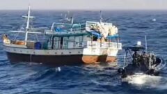 O barco brasileiro batizado de Efésios 5-20 medindo 25 metros foi abordado por um navio de patrulha da Polícia Nacional.
