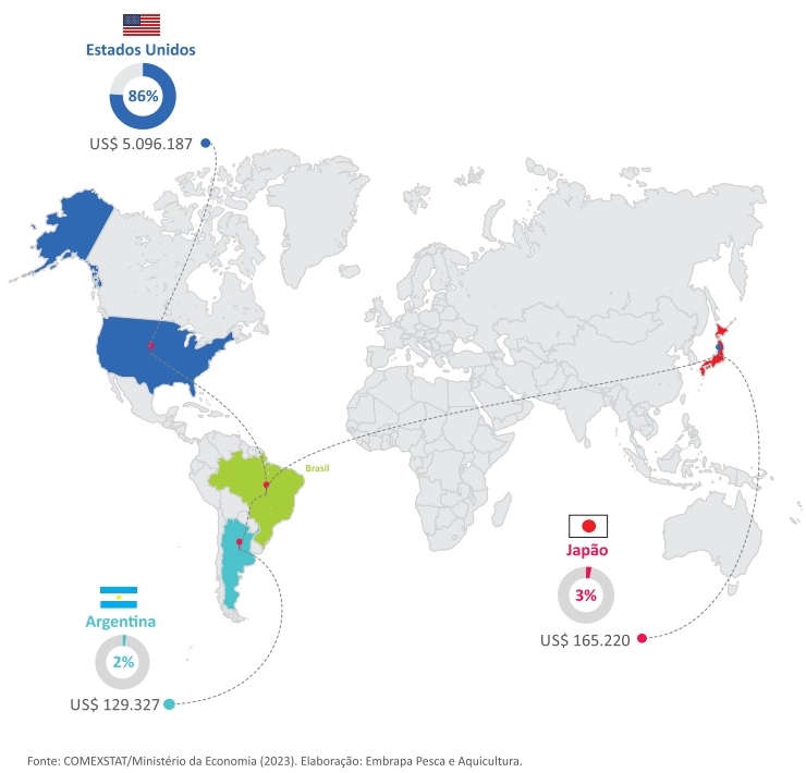 No Brasil, quase a totalidade da produção da piscicultura é consumida internamente. São cerca de 98% que ficam no mercado interno. “O mercado brasileiro não absorve apenas a produção nacional, como também é um grande importador de pescado. Em 2022, o país importou US$ 1,4 bilhão em pescado, o que equivale a cerca de R$ 7 bilhões. Apenas as importações de salmão totalizaram US$ 803 milhões”, explica Manoel, mostrando a competição entre os produtos nacional e internacional no que se refere a preço e qualidade.