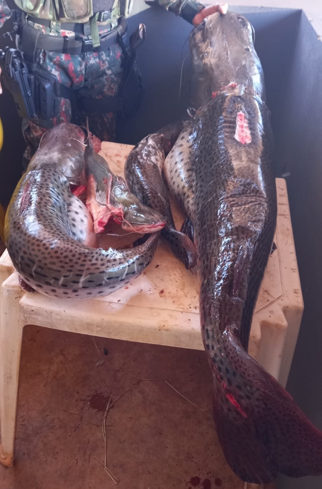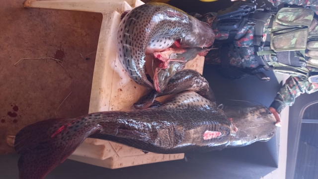 Durante verificação de uma denúncia anônima sobre prática de pesca predatória, uma equipe da PMA de Dourados (MS) deslocou-se até um rancho localizado à margem do Rio Vacaria, no município de Nova Alvorada do Sul (MS). No decorrer da fiscalização, foram encontrados quatro exemplares de pescado em um refrigerador, dos quais dois pintados e um barbado encontravam-se em desacordo com a medida prevista pela legislação, totalizando 38kg de pescado.