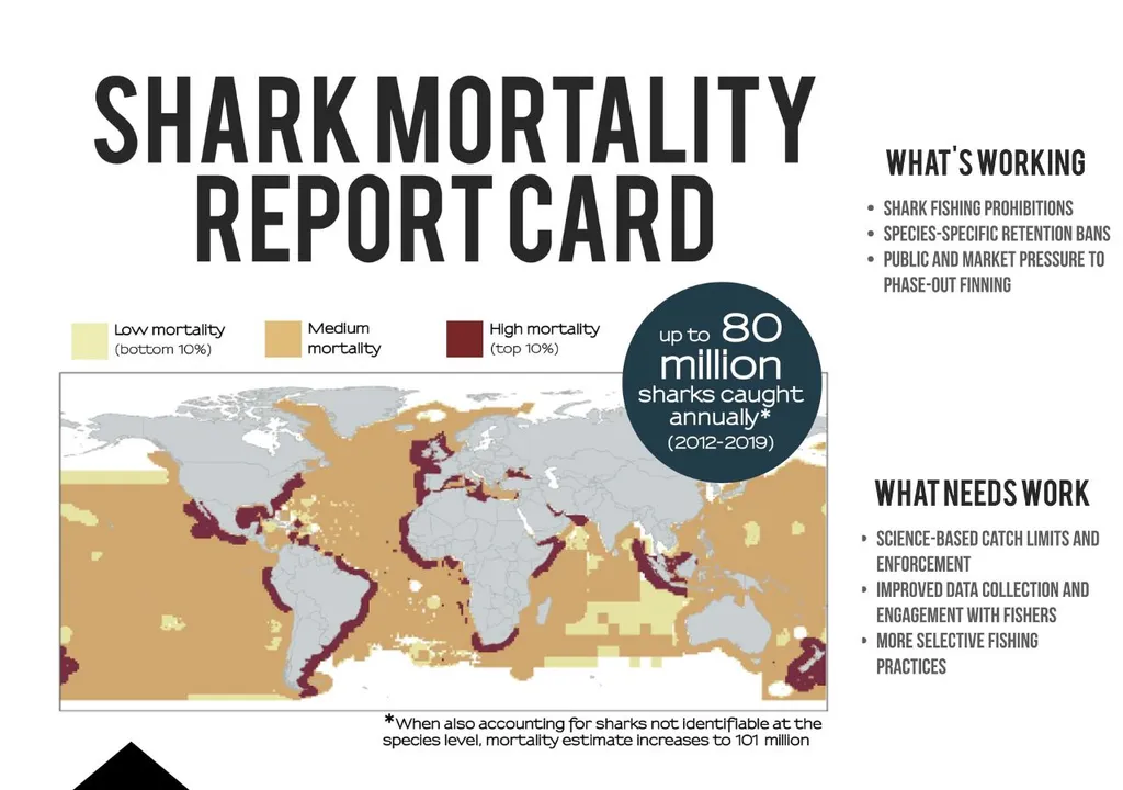 O estudo revelou que, embora tenha havido um aumento de 10 vezes nas regulamentações sobre pesca e remoção de barbatanas de tubarões, a mortalidade permaneceu mais ou menos a mesma. Estima-se que 76 milhões de tubarões foram mortos em 2012 devido à pesca, e pelo menos 80 milhões morreram em 2018.