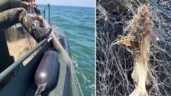 Uma equipe da Polícia Ambiental Marítima do 3º Batalhão Policial Ambiental (BPAmb) recolheu 500 metros de rede de pesca ilegal instalada na entrada do Canal do Estuário, em Santos, na tarde de domingo (10). Diversas espécies estavam presas no material e, aqueles que ainda estavam vivos, foram devolvidos ao mar pelos agentes. Apesar do flagrante, ninguém foi preso.
