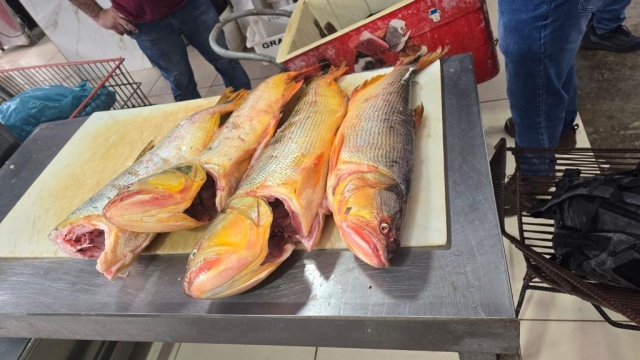 Após confirmar que o carrinho pertencia ao comércio alvo da investigação, os investigadores realizaram a abordagem no local. Dentro do carrinho, os policiais encontraram diversos exemplares de peixe de espécie proibida, como dourado (com e sem cabeça) e pintados fora da medida.